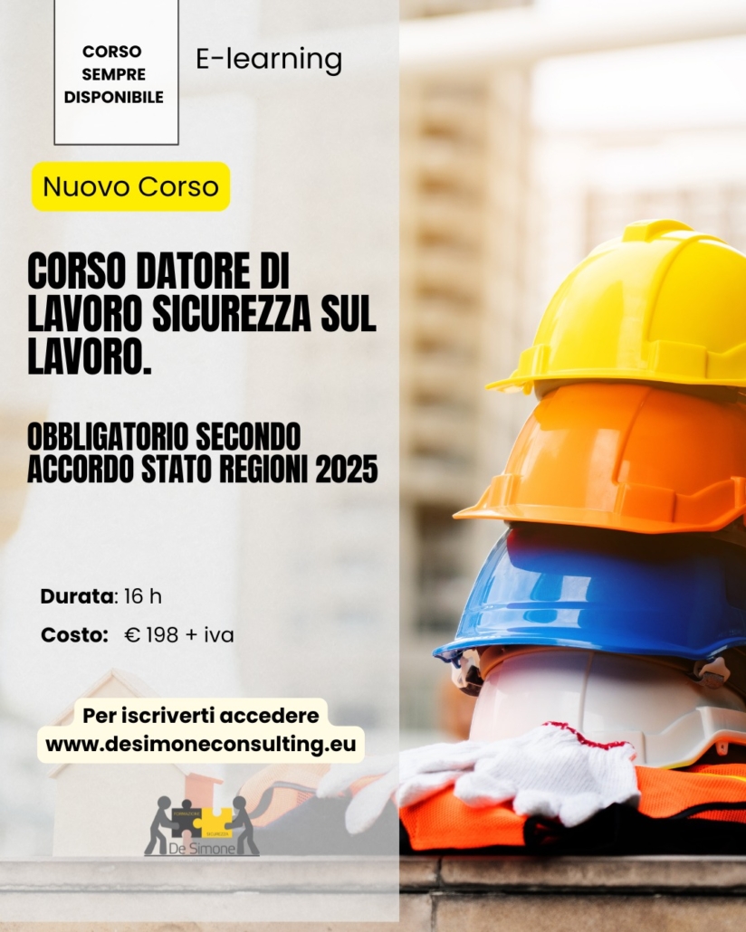 https://www.desimoneconsulting.eu/wp-content/uploads/2022/11/logosrls-2.jpg00Antonio De Simonehttps://www.desimoneconsulting.eu/wp-content/uploads/2022/11/logosrls-2.jpgAntonio De Simone2025-10-25 17:38:432025-10-25 17:38:45CORSO DATORE DI LAVORO SICUREZZA SUL LAVORO – OBBLIGATORIO SECONDO ACCORDO STATO REGIONI 2025